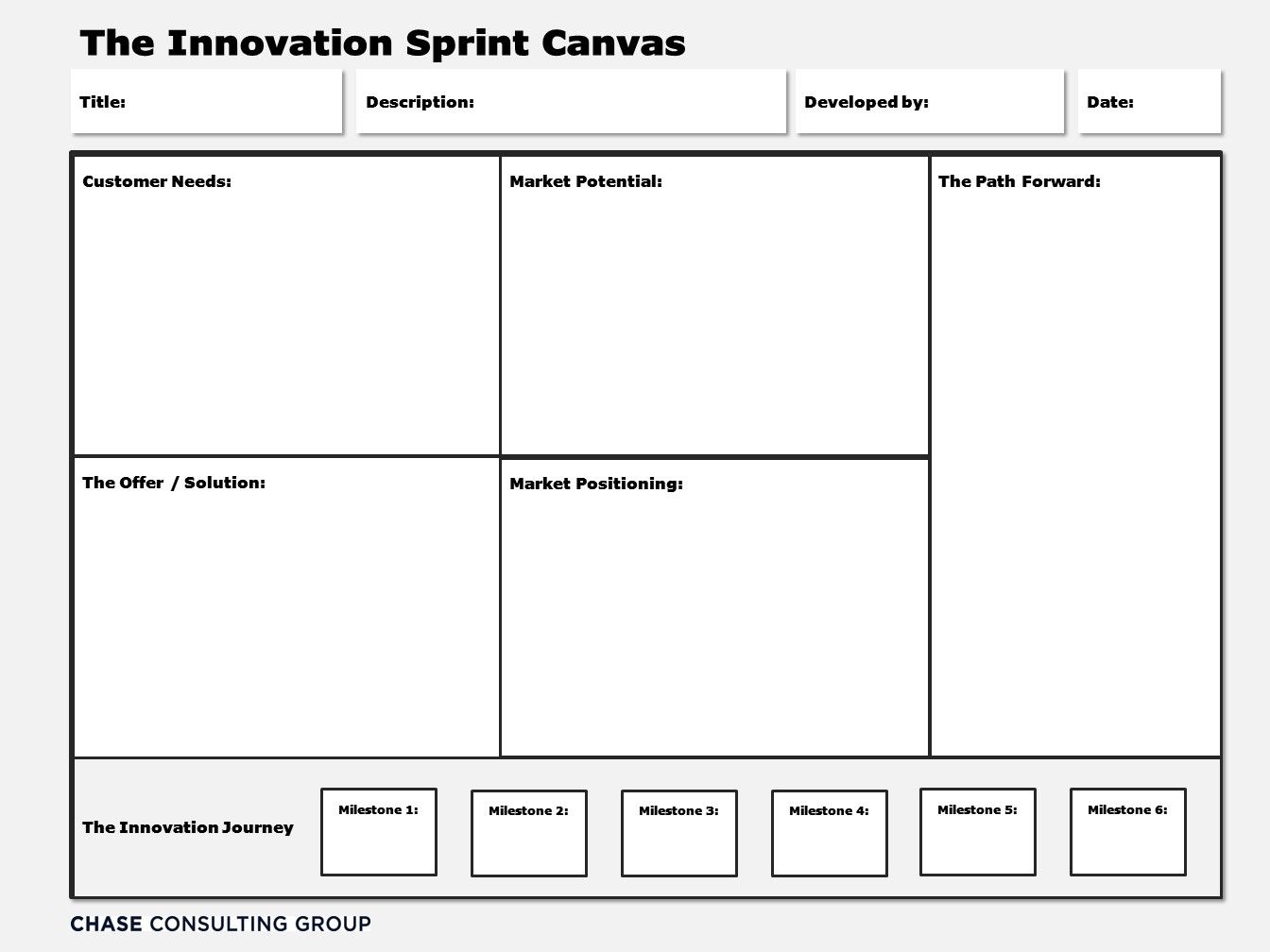 The innovation sprint canvas helps you effectively tell your story, get input, and ADVANCE your thinking in the next phase of the innovation journey.